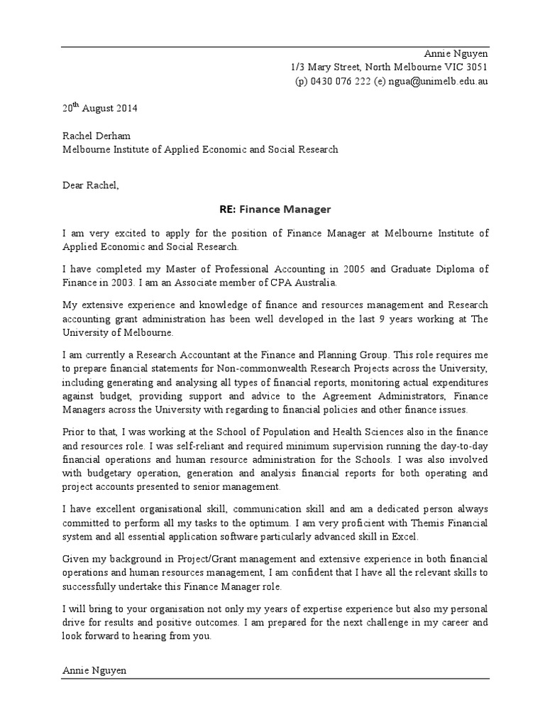 This finance job application can be sent in email or letter on mailing address with your resume for the position of finance officer, finance manager, finance director, etc. When writing a cover letter, be sure to reference the requirements listed in the job description.in your letter, reference your most relevant or exceptional qualifications to help employers see why you're a great fit for the role. Senior accountant cover letter sample. With my solid understanding of financial and accounting support gained throughout my educational and professional background. Project coordinator cover letter template.